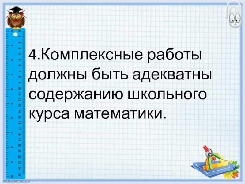 Слайд 74.Комплексные работы должны быть адекватны содержанию школьного курса математики.