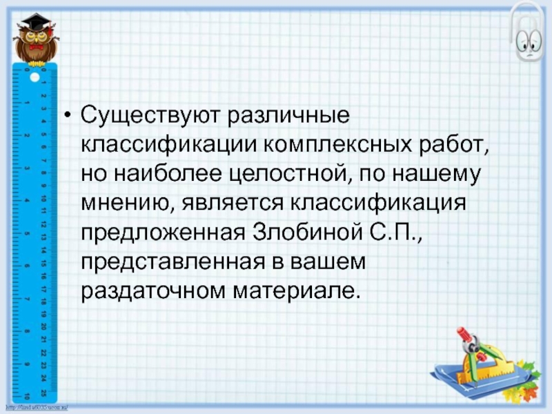 Слайд 8Существуют различные классификации комплексных работ, но наиболее целостной, по нашему мнению,