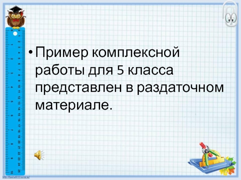 Слайд 9Пример комплексной работы для 5 класса представлен в раздаточном материале.