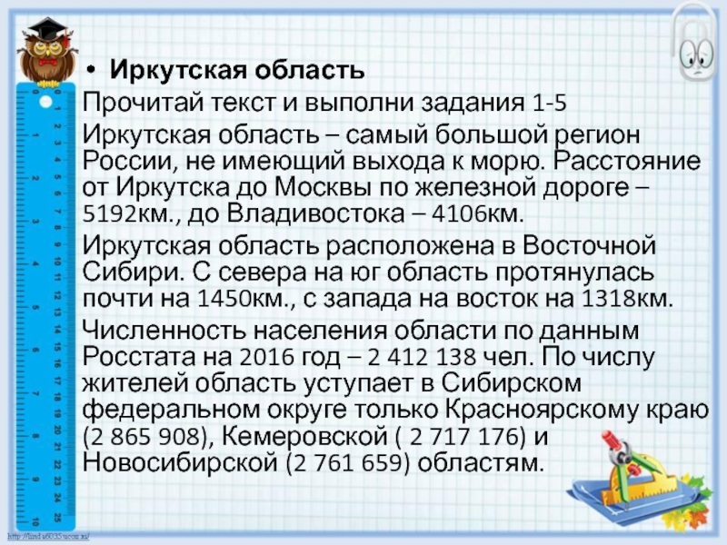 Иркутская областьПрочитай текст и выполни задания 1-5Иркутская область – самый большой регион России, не имеющий выхода к