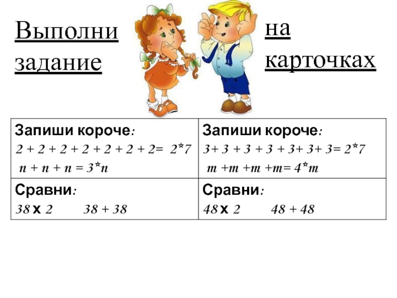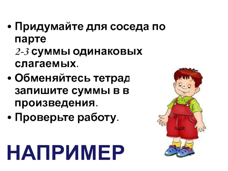 Придумайте для соседа по парте 2-3 суммы одинаковых слагаемых.