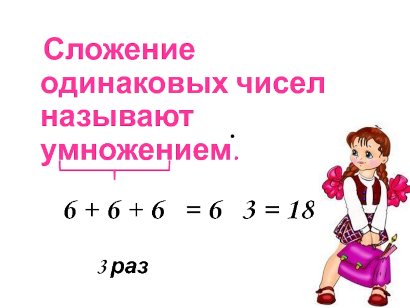 Сложение одинаковых чисел называют умножением. 6 + 6 + 6 = 6 3 = 18 3 раз
