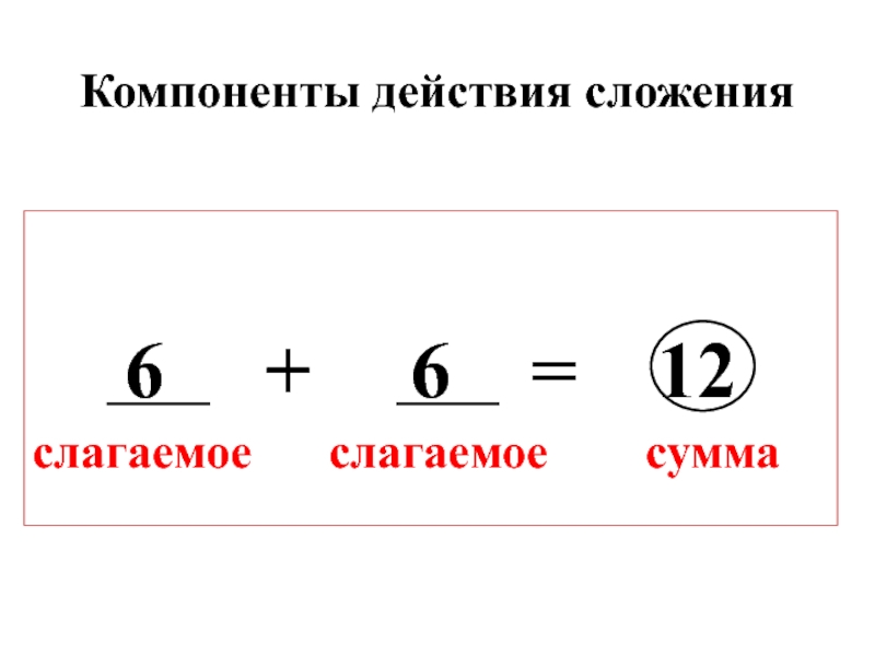 Компоненты действия сложения 6   +   6  =  12слагаемоеслагаемоесумма