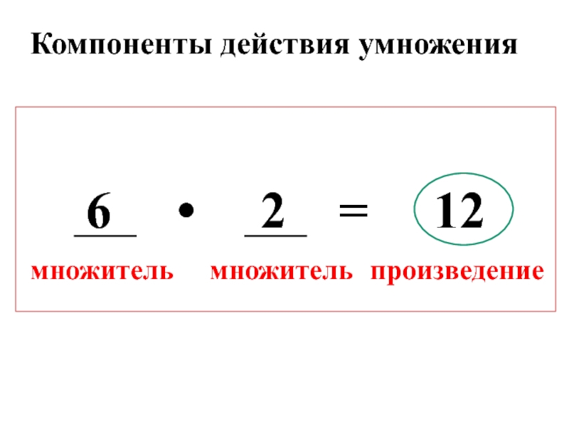 6   •   2  =   12множительмножительпроизведениеКомпоненты действия умножения