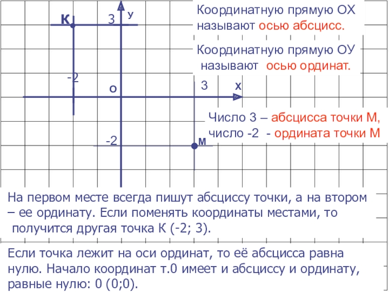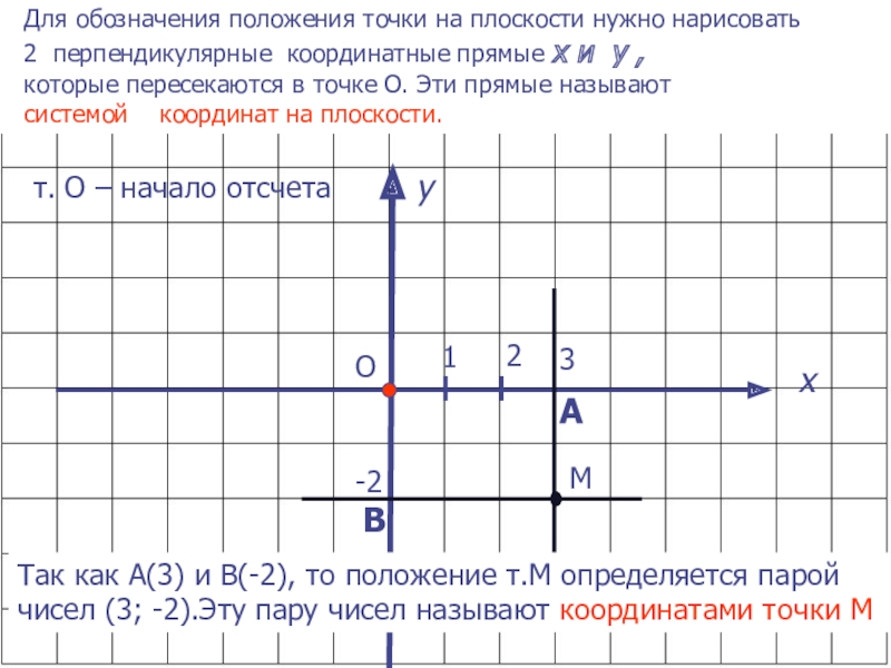 Так как А(3) и В(-2), то положение т.М определяется парой чисел (3; -2).Эту пару чисел называют координатами точки М