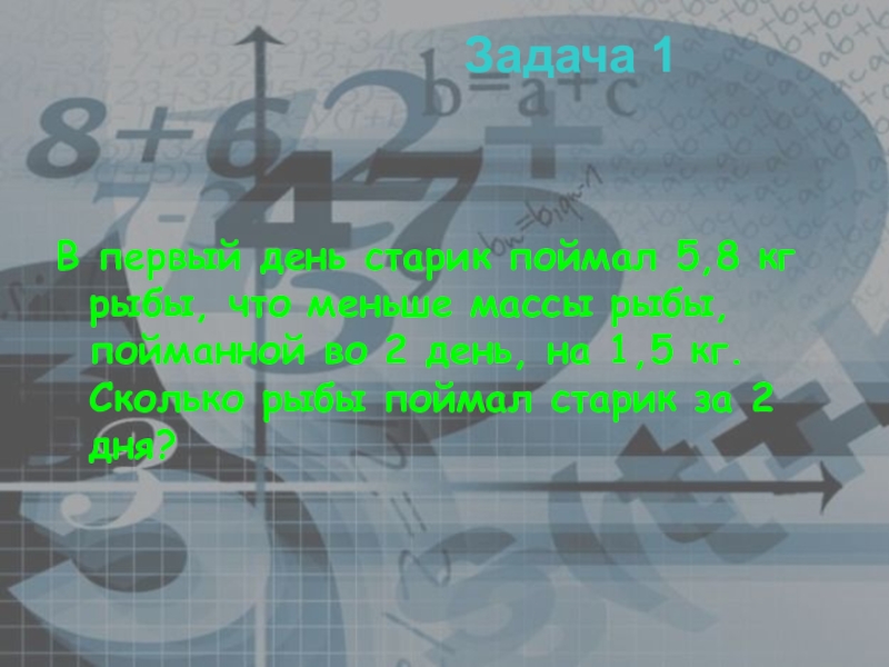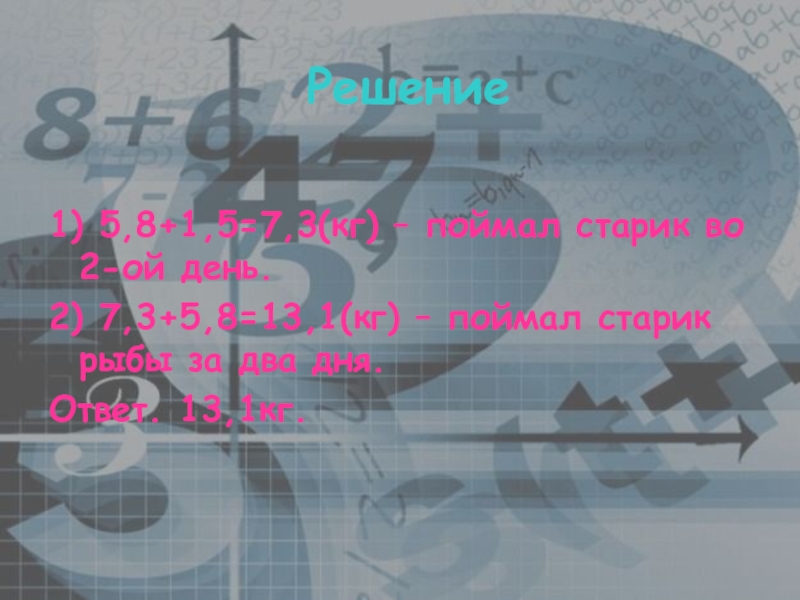 1) 5,8+1,5=7,3(кг) – поймал старик во 2-ой день.