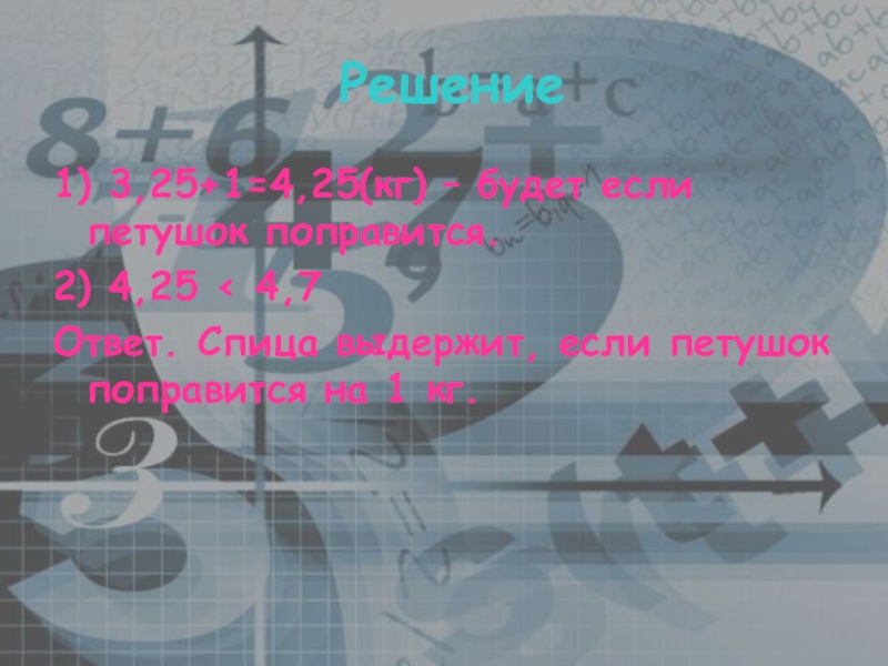 1) 3,25+1=4,25(кг) – будет если петушок поправится.