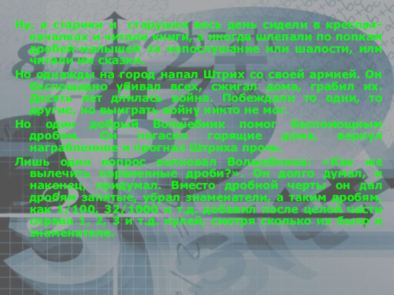 Лишь один вопрос волновал Волшебника: «Как же вылечить пораненные дроби?». Он долго думал, и наконец, придумал. Вместо дробной черты он дал дробям запятые, убрал знаменатели, а таким дробям, как 1/100, 32/1000 и т.д. добавил после целой части справа 1, 2, 3 и т.д. нулей, смотря сколько их было в знаменателе.