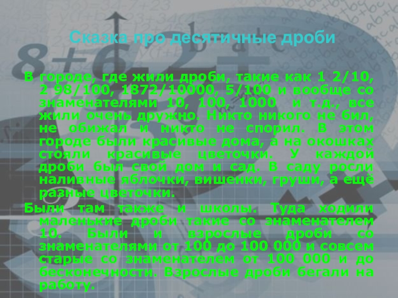 2/10, 2 98/100, 1872/10000, 5/100 и вообще со знаменателями 10, 100, 1000 и т.д., все жили очень дружно. Никто никого не бил, не обижал и никто не спорил. В этом городе были красивые дома, а на окошках стояли красивые цветочки. У каждой дроби был свой дом и сад. В саду росли наливные яблочки, вишенки, груши, а ещё разные цветочки.