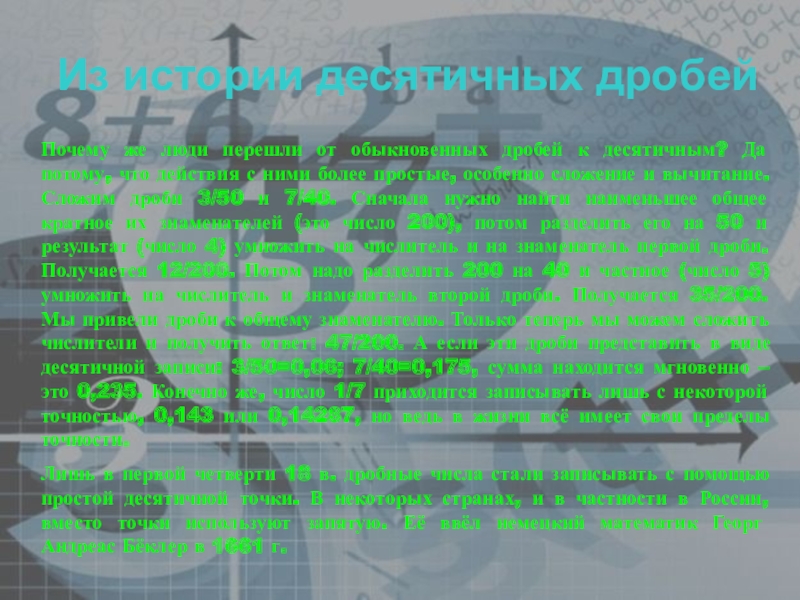 десятичным? Да потому, что действия с ними более простые, особенно сложение и вычитание. Сложим дроби 3/50 и 7/40. Сначала нужно найти наименьшее общее кратное их знаменателей (это число 200), потом разделить его на 50 и результат (число 4) умножить на числитель и на знаменатель первой дроби. Получается 12/200. Потом надо разделить 200 на 40 и частное (число 5) умножить на числитель и знаменатель второй дроби. Получается 35/200. Мы привели дроби к общему знаменателю. Только теперь мы можем сложить числители и получить ответ: 47/200. А если эти дроби представить в виде десятичной записи: 3/50=0,06; 7/40=0,175, сумма находится мгновенно – это 0,235. Конечно же, число 1/7 приходится записывать лишь с некоторой точностью, 0,143 или 0,14287, но ведь в жизни всё имеет свои пределы точности.