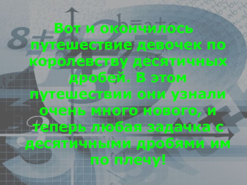 Слайд 19Вот и окончилось путешествие девочек по королевству десятичных дробей. В этом