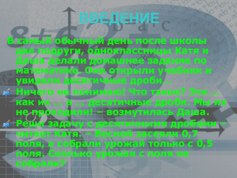 Реши задачу с десятичными дробями – читает Катя. – Весной засеяли 0,7 поля, а собрали урожай только с 0,5 поля. Сколько урожая с поля не собрали?