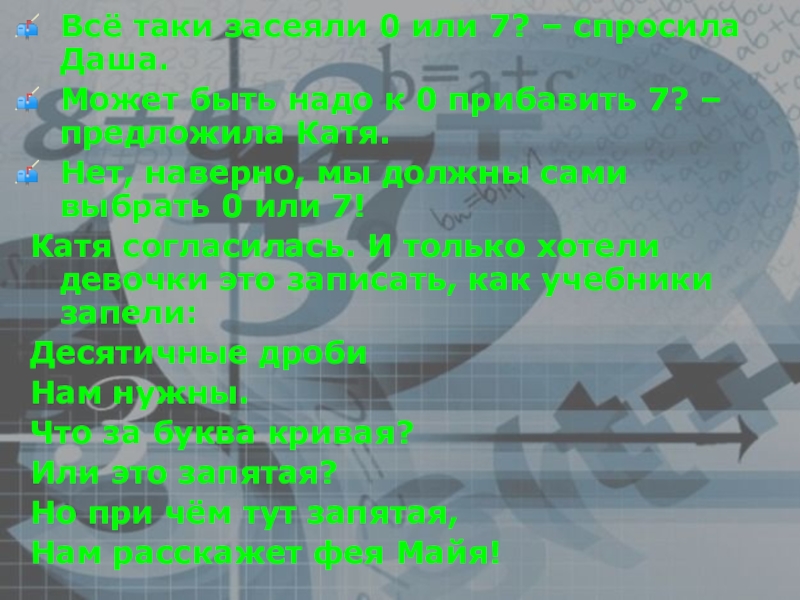 Ничего не понимаю! Что такое? Эти … как их … а … десятичные дроби. Мы их не проходили! – возмутилась Даша.