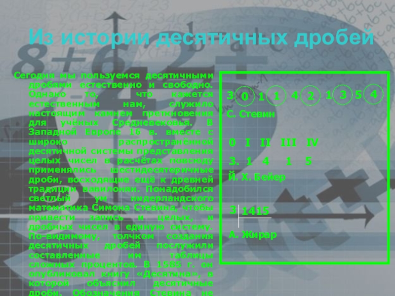 Однако то, что кажется естественным нам, служило настоящим камнем преткновения для учёных Средневековья. В Западной Европе 16 в. вместе с широко распространённой десятичной системы представления целых чисел в расчётах повсюду применялись шестидесятеричные дроби, восходящие ещё к древней традиции вавилонян. Понадобился светлый ум нидерландского математика Симона Стевина, чтобы привести запись и целых, и дробных чисел в единую систему. По-видимому, толчком создания десятичных дробей послужили составленные им таблицы сложных процентов. В 1585 г. он опубликовал книгу «Десятина», в которой объяснил десятичные дроби. Обозначения Стевина не отличались совершенством, так же как и обозначения его коллег и последователей. Вот как бы они записали число 3,1415: