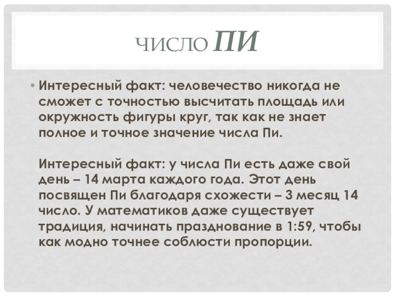 или окружность фигуры круг, так как не знает полное и точное значение числа Пи. Интересный факт: у числа Пи есть даже свой день – 14 марта каждого года. Этот день посвящен Пи благодаря схожести – 3 месяц 14 число. У математиков даже существует традиция, начинать празднование в 1:59, чтобы как модно точнее соблюсти пропорции.