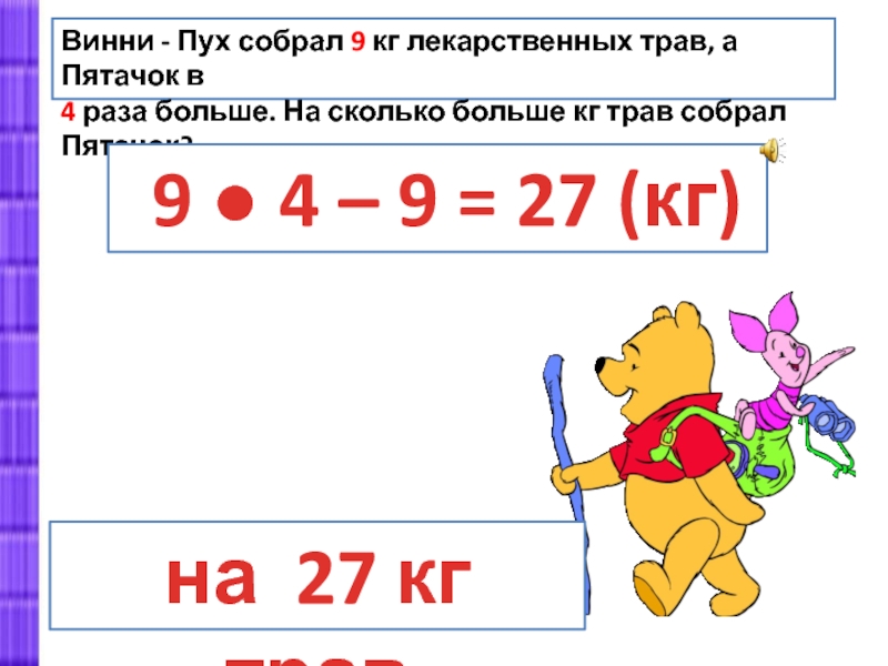 9 ● 4 – 9 = 27 (кг)