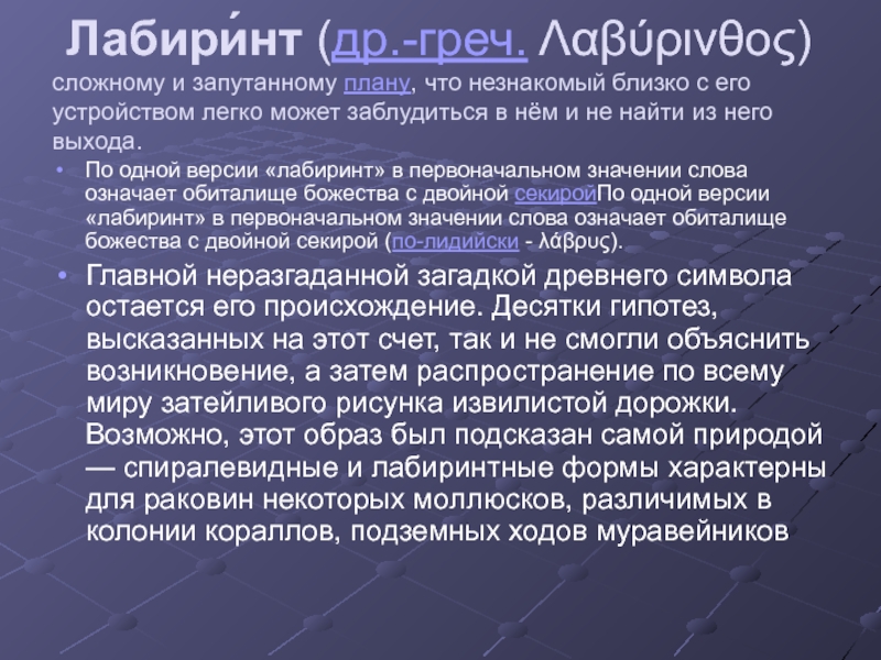 По одной версии «лабиринт» в первоначальном значении слова означает обиталище божества с двойной секиройПо одной версии «лабиринт» в первоначальном значении слова означает обиталище божества с двойной секирой (по-лидийски - λάβρυς).