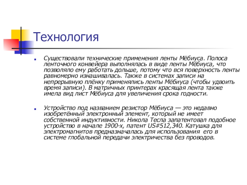 Существовали технические применения ленты Мёбиуса. Полоса ленточного конвейера выполнялась в виде
