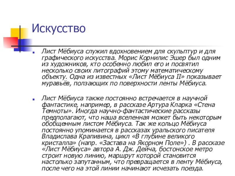Лист Мёбиуса служил вдохновением для скульптур и для графического искусства. Морис