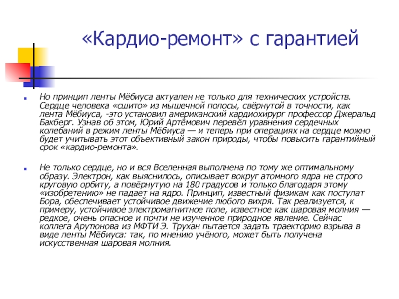 устройств. Сердце человека «сшито» из мышечной полосы, свёрнутой в точности, как лента Мёбиуса, -это установил американский кардиохирург профессор Джеральд Бакберг. Узнав об этом, Юрий Артёмович перевёл уравнения сердечных колебаний в режим ленты Мёбиуса — и теперь при операциях на сердце можно будет учитывать этот объективный закон природы, чтобы повысить гарантийный срок «кардио-ремонта».
