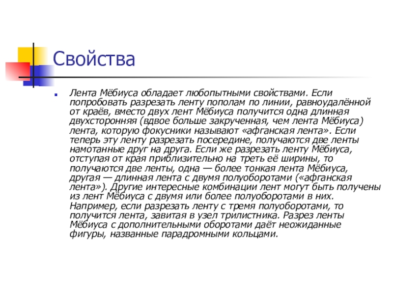 Лента Мёбиуса обладает любопытными свойствами. Если попробовать разрезать ленту пополам по