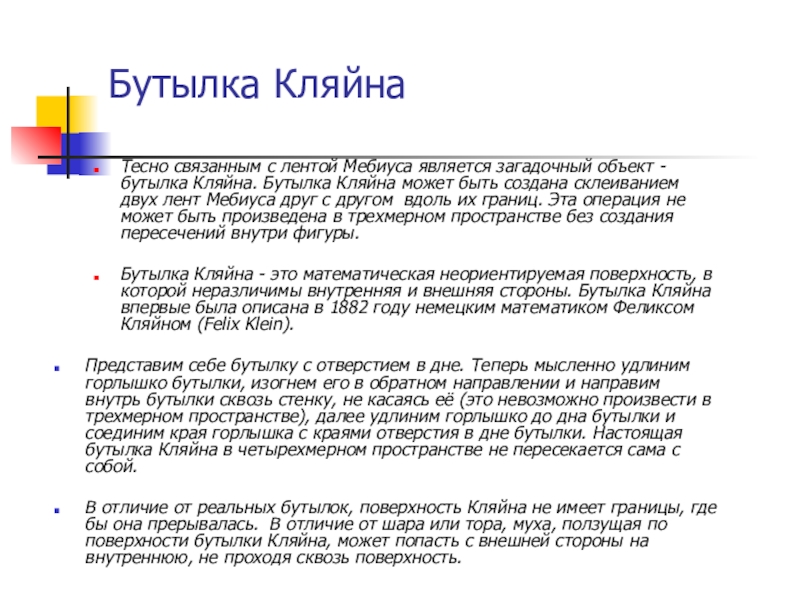 Тесно связанным с лентой Мебиуса является загадочный объект - бутылка