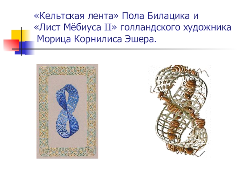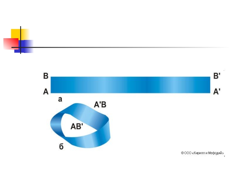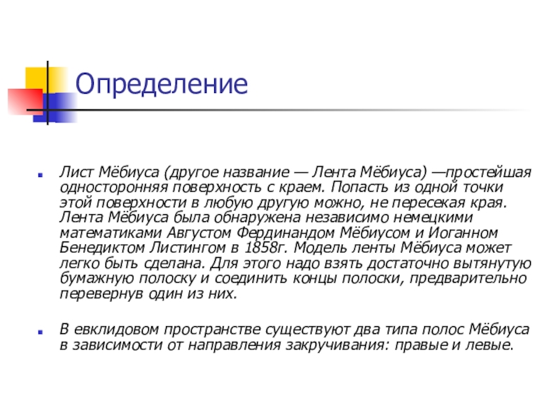 краем. Попасть из одной точки этой поверхности в любую другую можно, не пересекая края. Лента Мёбиуса была обнаружена независимо немецкими математиками Августом Фердинандом Мёбиусом и Иоганном Бенедиктом Листингом в 1858г. Модель ленты Мёбиуса может легко быть сделана. Для этого надо взять достаточно вытянутую бумажную полоску и соединить концы полоски, предварительно перевернув один из них.