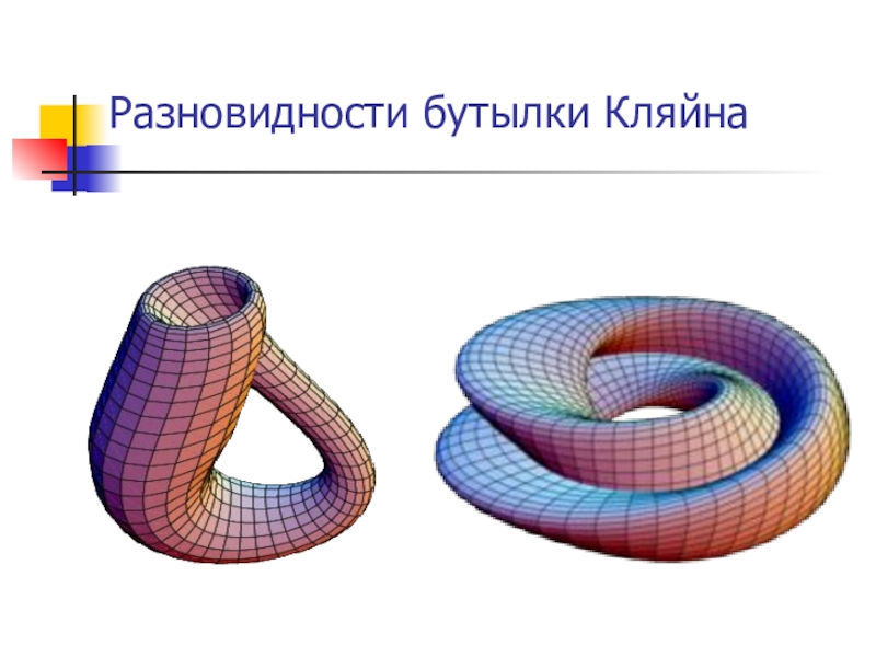 Кляйна. Бутылка Кляйна может быть создана склеиванием двух лент Мебиуса друг с другом вдоль их границ. Эта операция не может быть произведена в трехмерном пространстве без создания пересечений внутри фигуры.