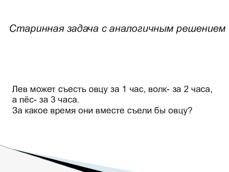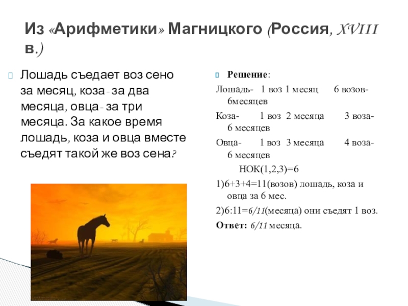 Лошадь съедает воз сено за месяц, коза- за два месяца, овца- за три месяца. За какое время лошадь, коза и овца вместе съедят такой же воз сена?