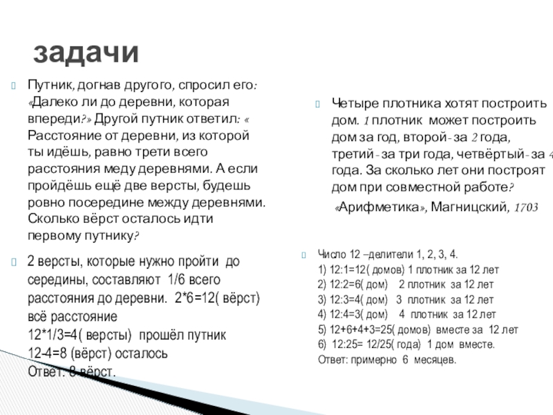 Число 12 –делители 1, 2, 3, 4. 1) 12:1=12( домов) 1 плотник за 12 лет 2) 12:2=6( дом) 2 плотник за 12 лет 3) 12:3=4( дом) 3 плотник за 12 лет 4) 12:4=3( дом) 4 плотник за 12 лет 5) 12+6+4+3=25( домов) вместе за 12 лет 6) 12:25= 12/25( года) 1 дом вместе. Ответ: примерно 6 месяцев.