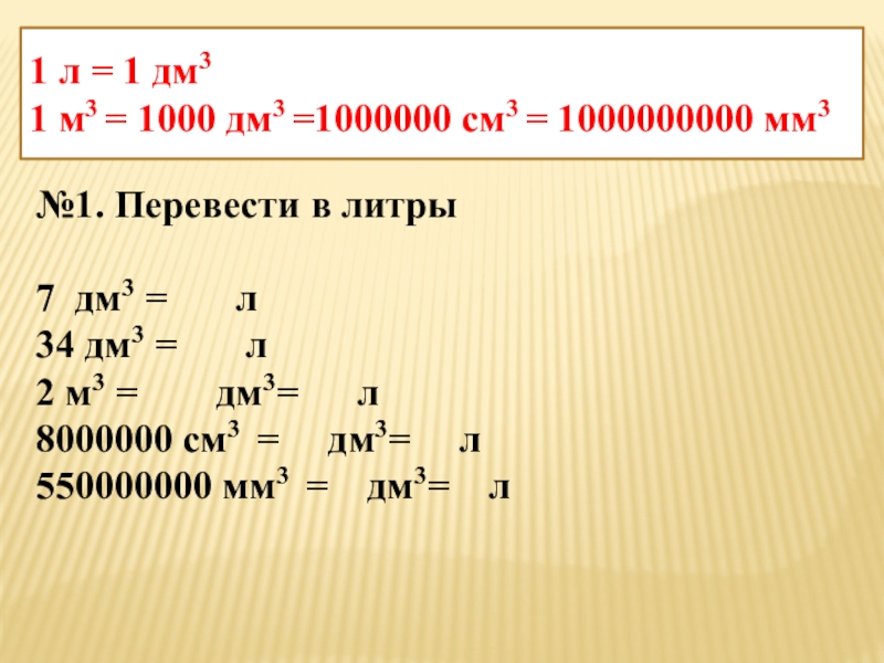 1 м3 = 1000 дм3 =1000000 см3 = 1000000000 мм3