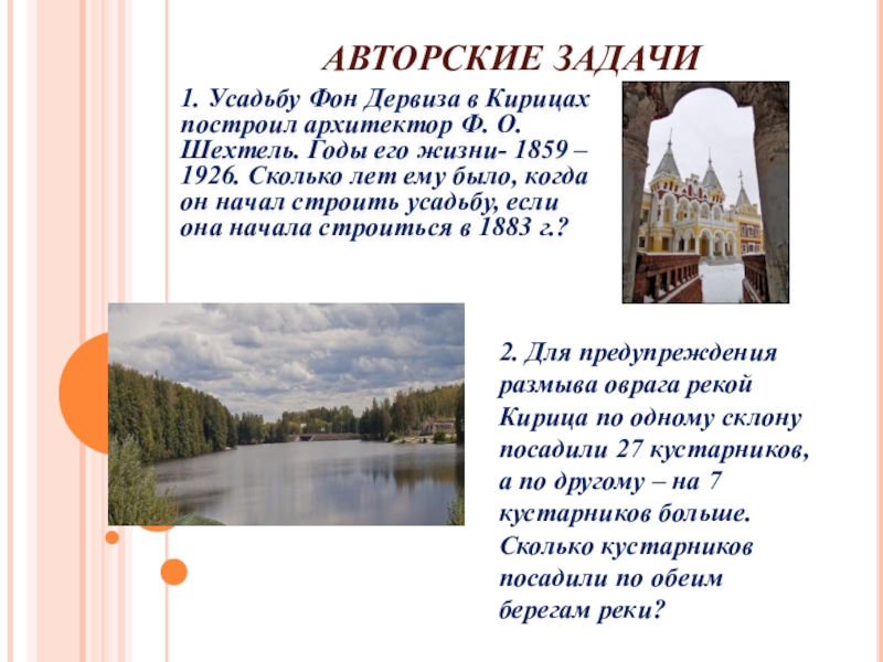 2. Для предупреждения размыва оврага рекой Кирица по одному склону посадили 27 кустарников, а по другому – на 7 кустарников больше. Сколько кустарников посадили по обеим берегам реки?