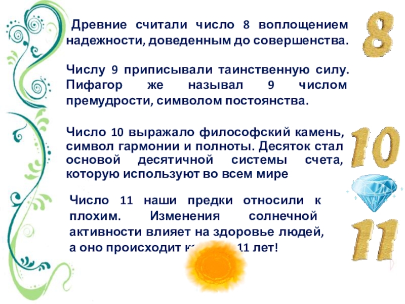 Число 10 выражало философский камень, символ гармонии и полноты. Десяток стал основой десятичной системы счета, которую используют во всем мире