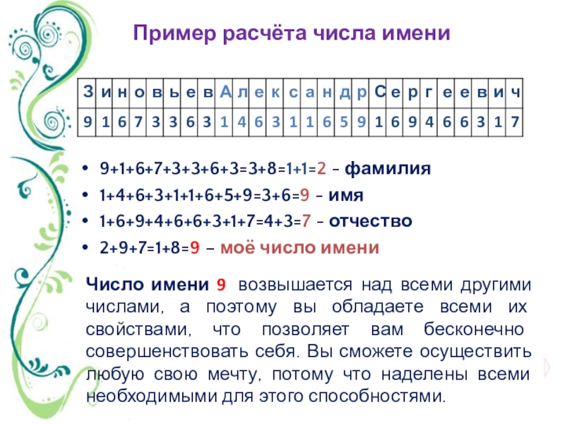 Число имени 9 возвышается над всеми другими числами, а поэтому вы обладаете всеми их свойствами, что позволяет вам бесконечно совершенствовать себя. Вы сможете осуществить любую свою мечту, потому что наделены всеми необходимыми для этого способностями.