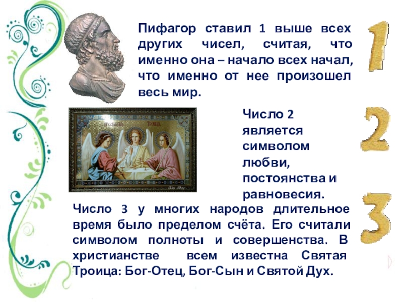 Число 3 у многих народов длительное время было пределом счёта. Его считали символом полноты и совершенства. В христианстве всем известна Святая Троица: Бог-Отец, Бог-Сын и Святой Дух.