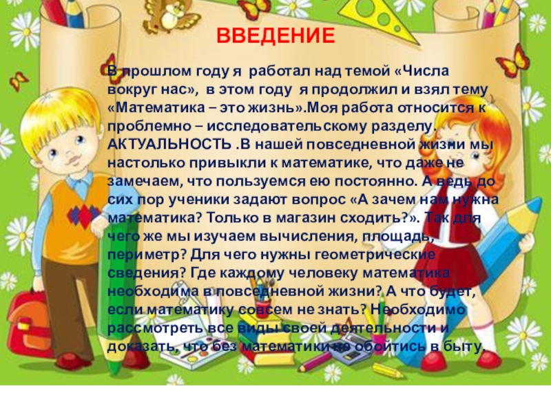 работал над темой «Числа вокруг нас», в этом году я продолжил и взял тему «Математика – это жизнь».Моя работа относится к проблемно – исследовательскому разделу.