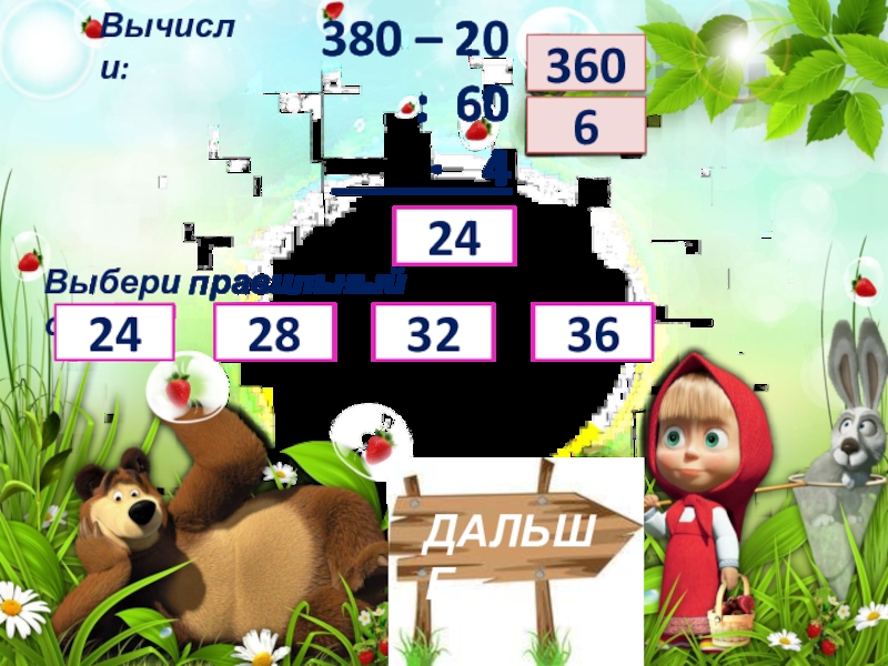 380 – 20    : 60    ·  4Вычисли:Выбери правильный ответ:32243606283624