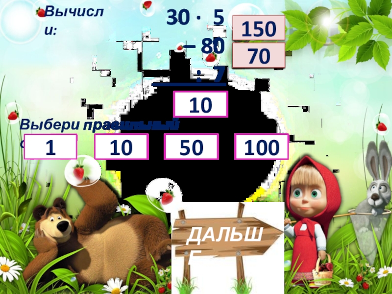 30 · 5    – 80    : 7Вычисли:Выбери правильный ответ:100101507015010
