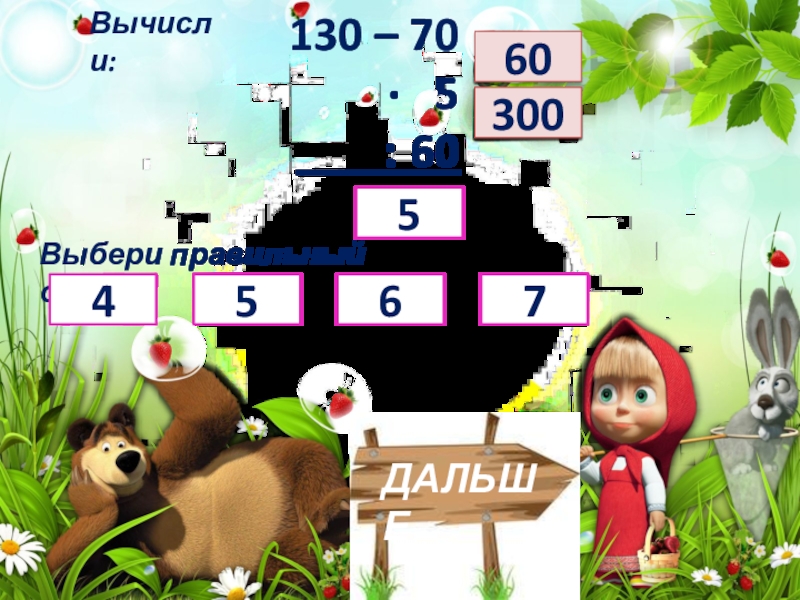 130 – 70    ·  5    : 60Вычисли:Выбери правильный ответ:6560300475