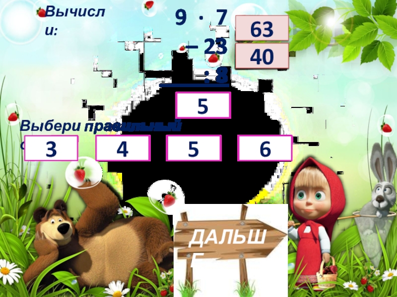 9 · 7    – 23    : 8Вычисли:Выбери правильный ответ:356340465