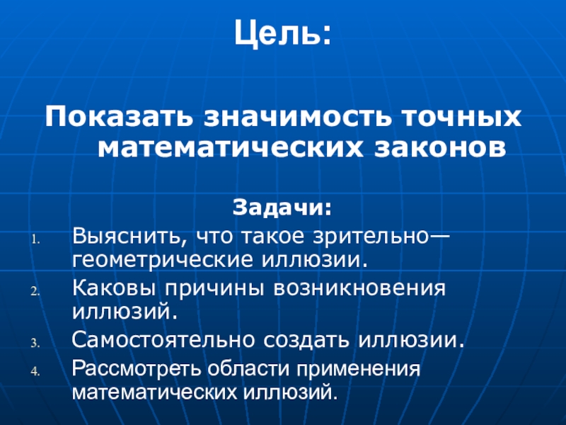 Цель: Показать значимость точных математических законовЗадачи:Выяснить, что такое зрительно—геометрические иллюзии.Каковы причины возникновения иллюзий.Самостоятельно создать иллюзии.Рассмотреть области применения