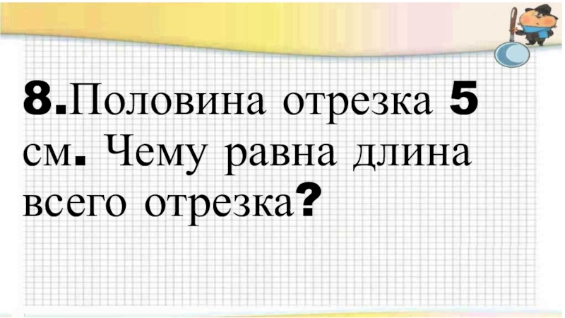 8.Половина отрезка 5 см. Чему равна длина всего отрезка?