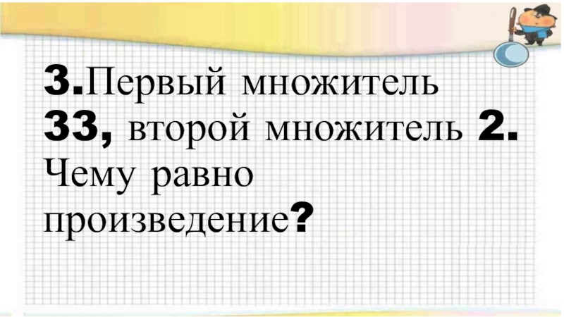3.Первый множитель 33, второй множитель 2. Чему равно произведение?