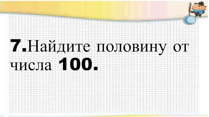 Слайд 87.Найдите половину от числа 100.