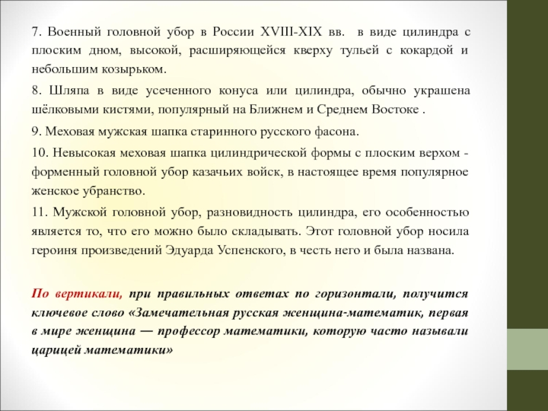 По вертикали, при правильных ответах по горизонтали, получится ключевое слово «Замечательная русская женщина-математик, первая в мире женщина — профессор математики, которую часто называли царицей математики»