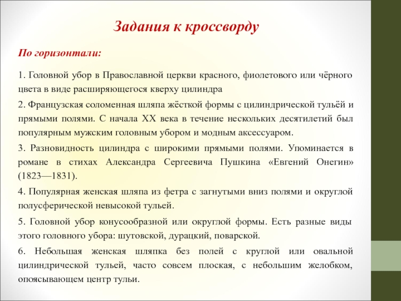 Задания к кроссвордуПо горизонтали:1. Головной убор в Православной церкви красного, фиолетового или чёрного цвета в виде расширяющегося кверху цилиндра2. Французская соломенная шляпа жёсткой формы с цилиндрической тульёй и прямыми полями. С начала XX века в течение