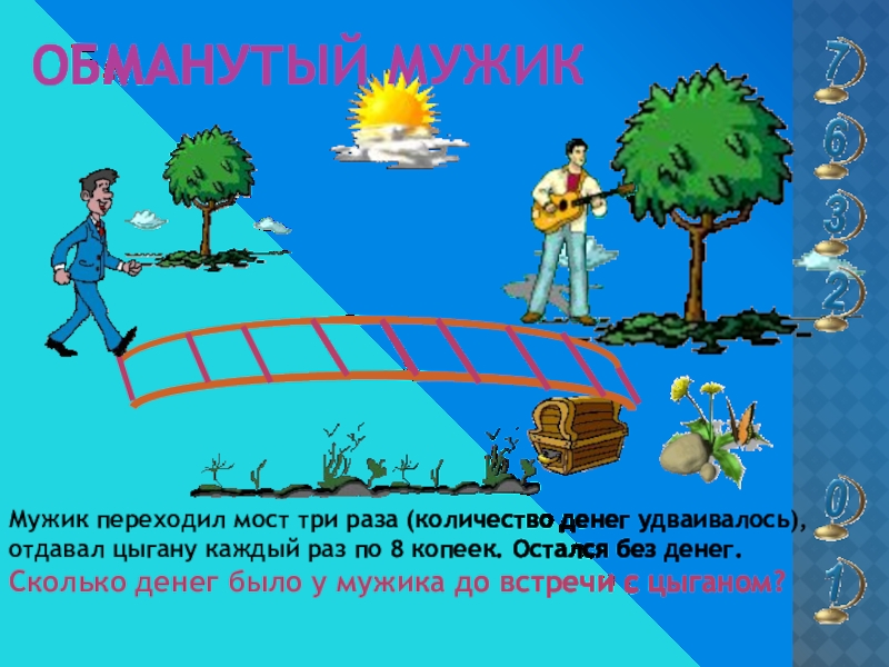 Уходя ,путник уплатил за свою долю 5 копеек.