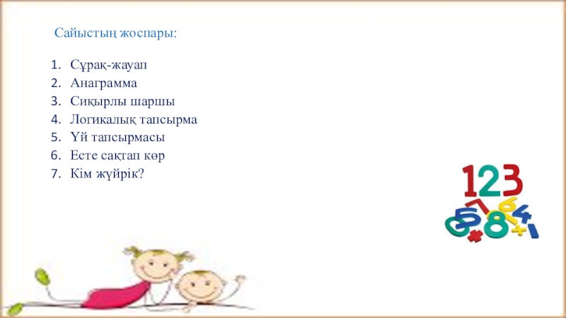 Сайыстың жоспары:  Сұрақ-жауапАнаграммаСиқырлы шаршыЛогикалық тапсырмаҮй тапсырмасыЕсте сақтап көрКім жүйрік?