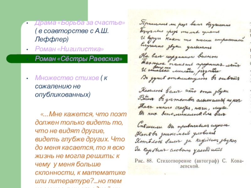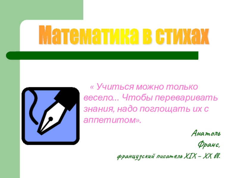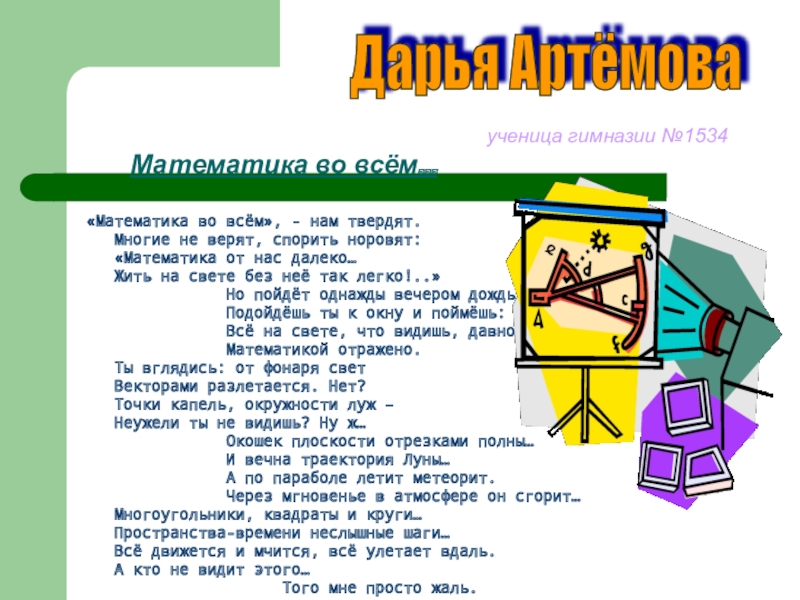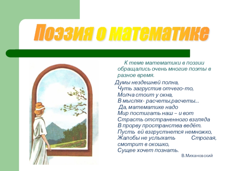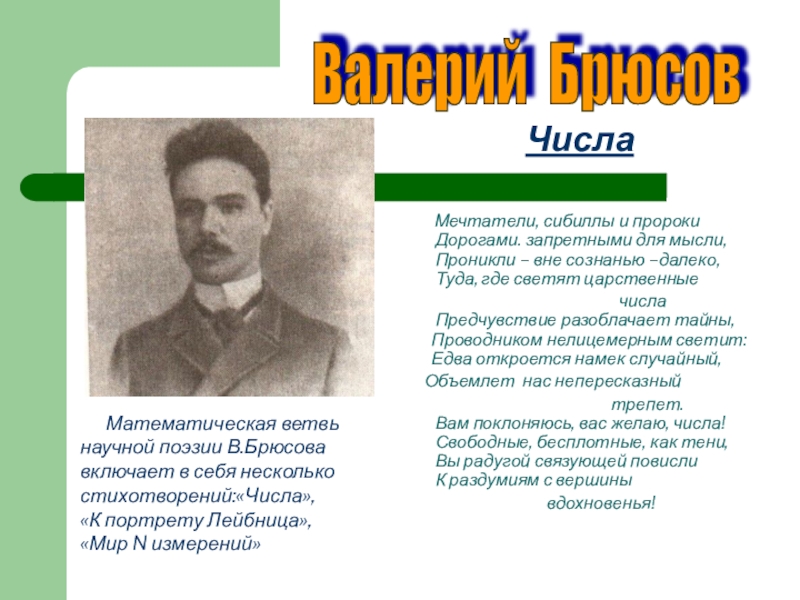 Математическая ветвь научной поэзии В.Брюсова включает в себя несколько стихотворений:«Числа»,