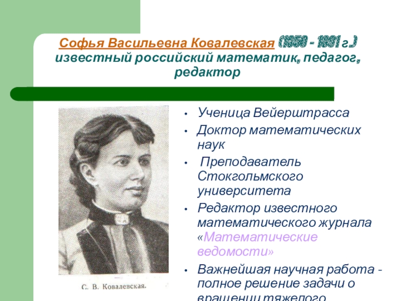 Важнейшая научная работа - полное решение задачи о вращении тяжелого твердого тела вокруг неподвижной точки.